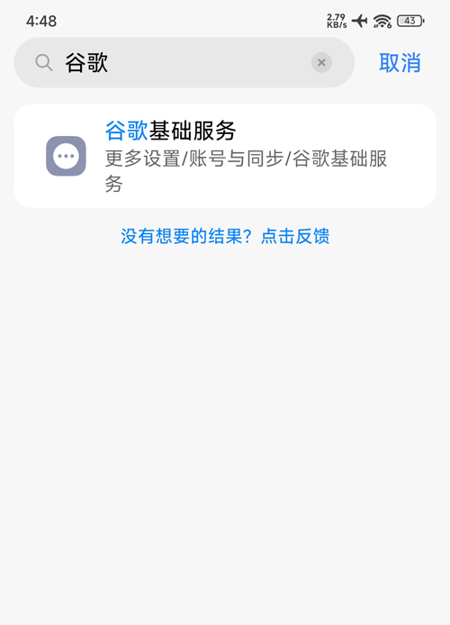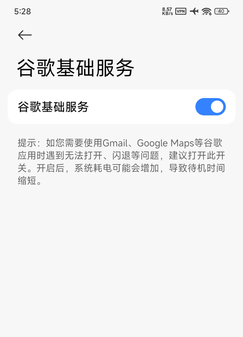1、小米/Redmi手机进入【设置】→ 搜索“谷歌”→ 点击“谷歌基础服务”→ 开启“谷歌基础服务”