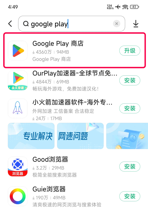 2、打开小米应用商店搜索“google play”→ 找到 Google Play 商店,点升级即可